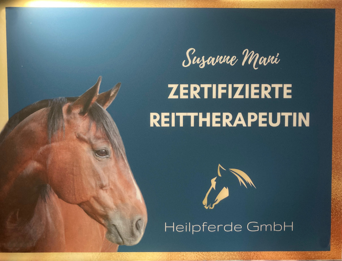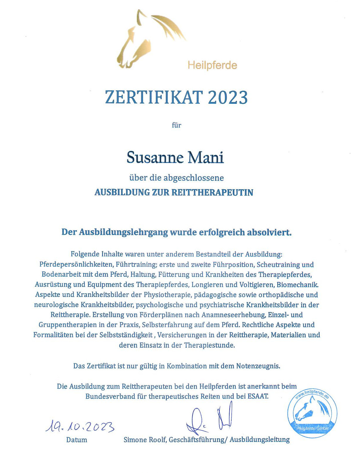 | 2023 | Ausbildung und erfolgreicher Abschluss zur Reittherapeutin bei der Heilpferde GmbH Deutschland |