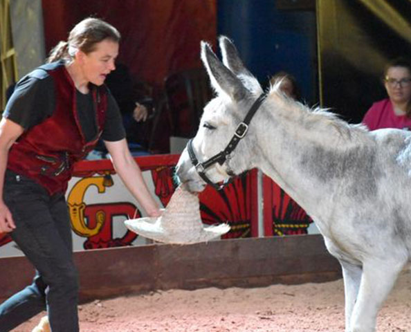 Er begleitet mich seit er eineinhalb Jahre alt ist. Sandro ist sehr verspielt und liebt "seine Spielsachen" zu apportieren. Im Stall bringt er unterschiedliche Gegenstände und lässt diese erst im Austausch gegen eine Belohnung los. Er kennt einige Zirkuslektionen. Bei neuen Situationen ist er erst skeptisch und vorsichtig, lässt sich dann mit viel Geduld zur Mitarbeit überzeugen.